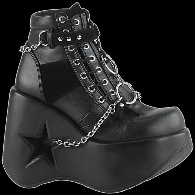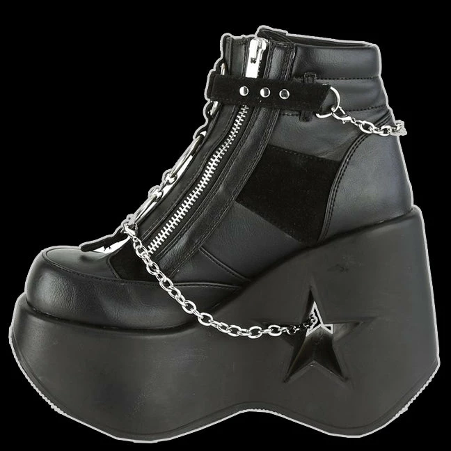 5″ (127mm) Star Cutout Platform Wedge Side Lace-Up Ankle Boot, Featuring Center O-Ring & Stud Details w/ Top Hook N’ Loop Straps & Chain Ornamentation on Heel & Through the Platform Cutout, Side Zip C