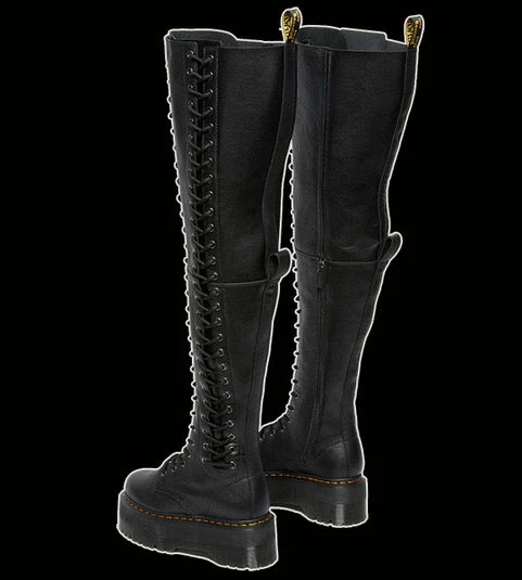 Footwear for the fearless. These towering 26-eye boots are welted on our highest ever platform: thestacked 2 1/4 inch Quad Retro Max. Built to make a scene. Crafted from a mix of soft Virginia leather and tumbled stretch PU for enhanced comfort, the thigh-high boots are loaded with gunmetal trims, a zip on the inside quarter and an adjustable lace for a secure fit. They’re marked by our unmistakable yellow welt stitch and heel loop. These sky-high platforms aren’t for the faint-hearted. Are you up to it?