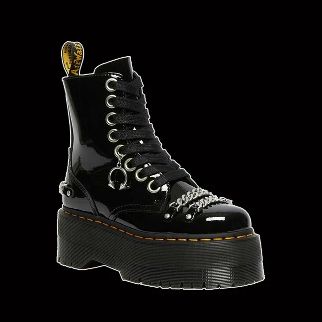Tall got tougher. Built on our highest ever sole: the 2 1/4 inch Quad Retro Max. Constructed from high shine durable Patent Lamper surrounded with hardware chains. Everything on this boot is turned up to the max with oversized eyelets. Finished with our unmistakable yellow Goodyear welt and AirWair heel loop.