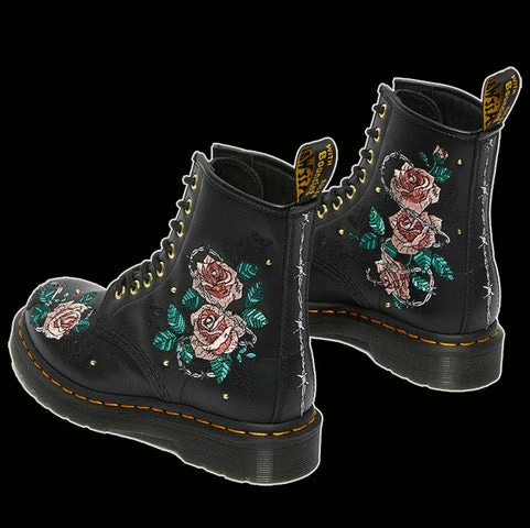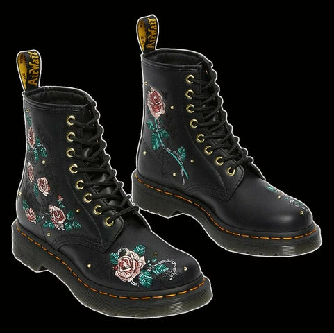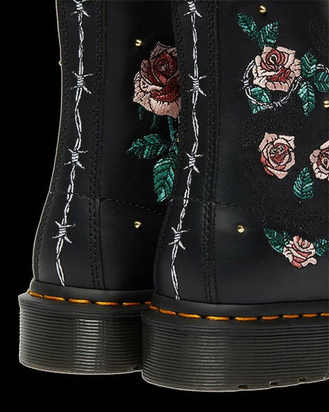 If you’re a longtime DM’s wearer, you’ll recognize our Vonda boots. The rose embroidery is becoming a Docs classic. New for the season, we’ve rebooted the collection with subtle chain details, mini gold studs and hidden tonal embroidery. Crafted from rugged-yet-comfortable Nappa leather, the boots are fitted with matching gold eyelets as well as our signature markings: yellow welt stitching, a Smoke DMs sole and a black and yellow heel loop.