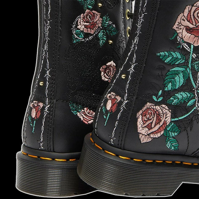 If you’re a longtime DM’s wearer, you’ll recognize our Vonda boots. The rose embroidery is becoming a Docs classic. New for the season, we’ve rebooted the collection with subtle chain details, mini gold studs and hidden tonal embroidery. Crafted from rugged-yet-comfortable Nappa leather, the boots are fitted with matching gold eyelets as well as our signature markings: yellow welt stitching, a Smoke DMs sole and a black and yellow heel loop.