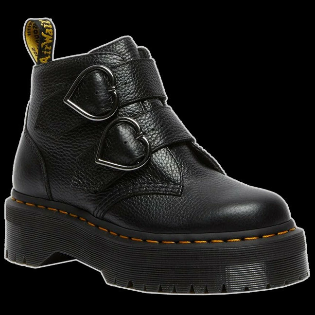 It’s back. And it’s louder than ever. Sitting on our towering 1 1/2 inches Quad sole, our new Devon Heart boot nods to our history of customization with DIY-inspired detailing. Fitted with two straps woven around standout heart-shaped buckles, the boot is built from fine grained Milled Nappa — a hardwearing pebbled leather. Made with padded quarters and tongue for additional comfort, the boots are finished with yellow welt stitching and a black and yellow heel loop.