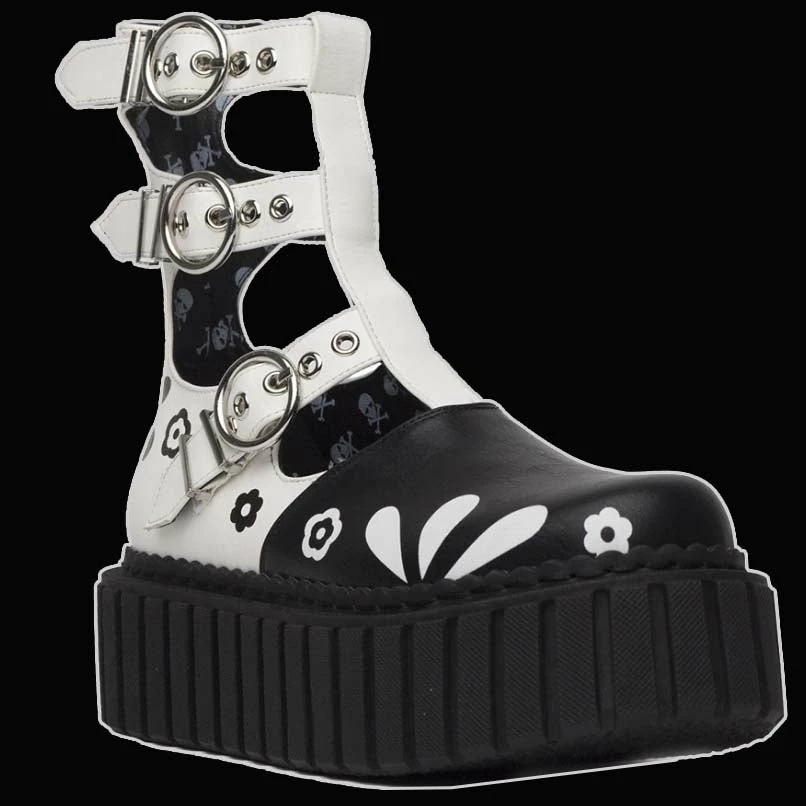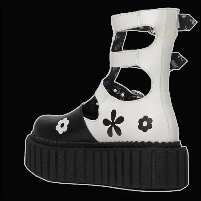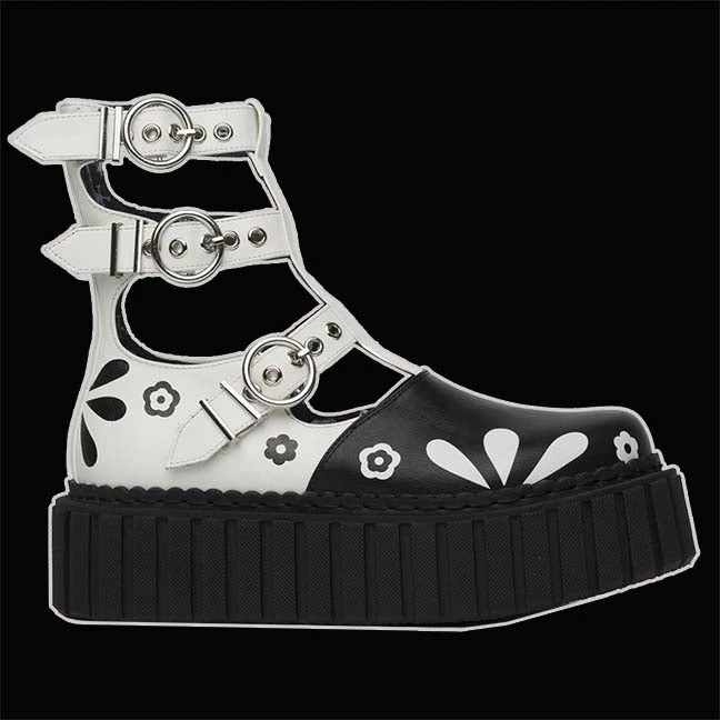 Buckled Up Chunky Creeper Ankle Boots in Black/White. Features include vegan materials on our exclusive Chunky creeper sole. Features also include our exclusive flower print through the boot. The boots also come with our open skeleton structure, with adjustable straps, silver O shaped buckles and silver eyelets.
