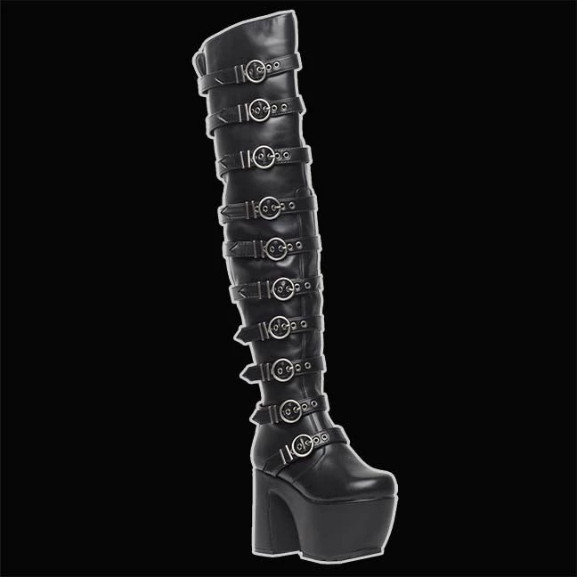 City Go Getter Thigh High Boots in Black. Features include vegan friendly materials on a high platform heel with a sharks teeth rubber sole. Features also include 10 adjustable silver circular buckles and a zip on the inside of the boots.