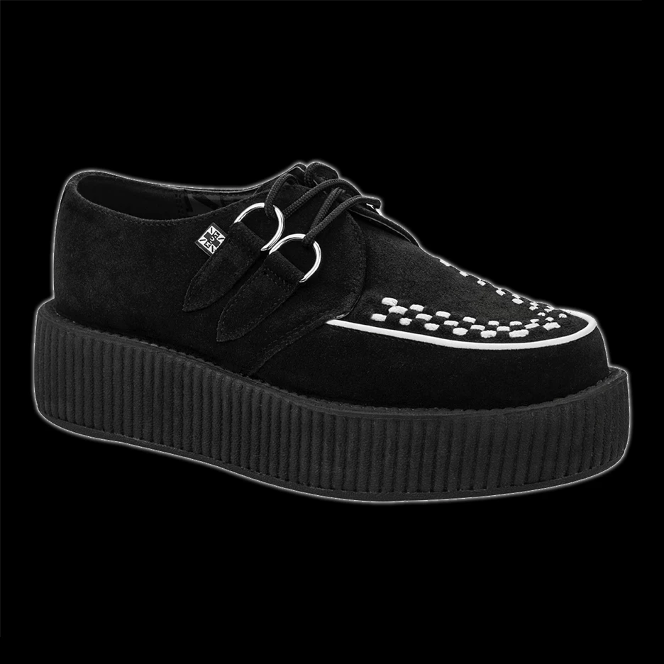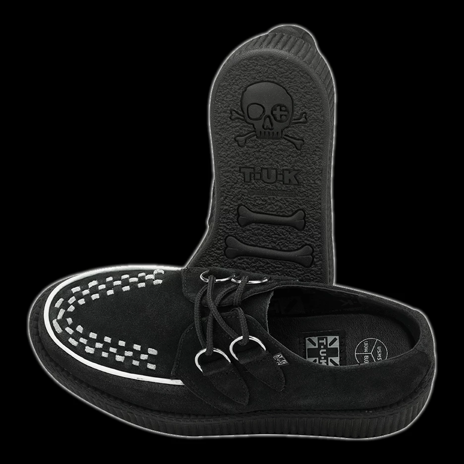 Made with a black sueded leather upper with white woven interlace and silver metal D-rings.