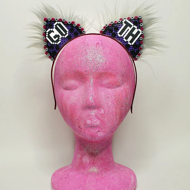 These ears are made from perler beads, mini perler bead charms, rhinestones, a flexible metal headband, faux fur, and wire reinforcements to make them durable.