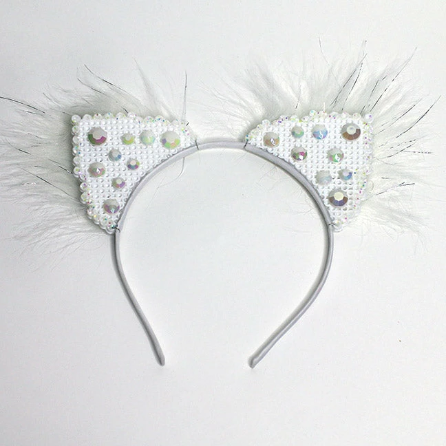 The perfect everyday kitten ears! This basic white set completes your outfit and adds fun glitter and rhinestones to your day!